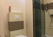 Łazienka jest duża z kabiną prysznicową, umywalką, lustrem oraz WC.