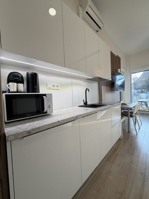 Aneks kuchenny jest w pełni wyposażony. W jego skład wchodzą: kuchenka z płytą elektryczną dwupalnikową, lodówka, czajnik elektryczny, ekspres do kawy, zastawa stołowa, komplet garnków oraz sztućce.