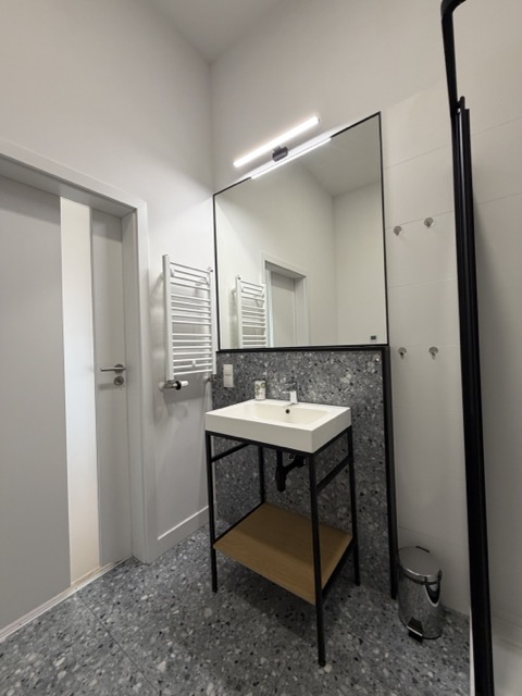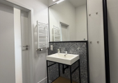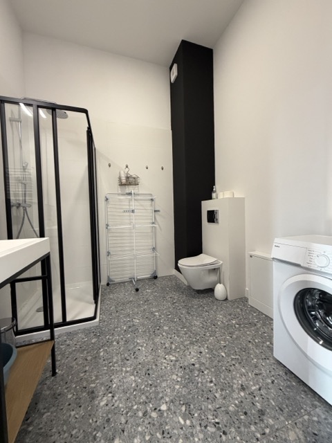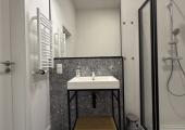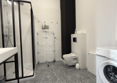 Łazienka jest w jasnej tonacji kolorystycznej z kabiną prysznicową, umywalką, pralką, lustrem oraz WC.