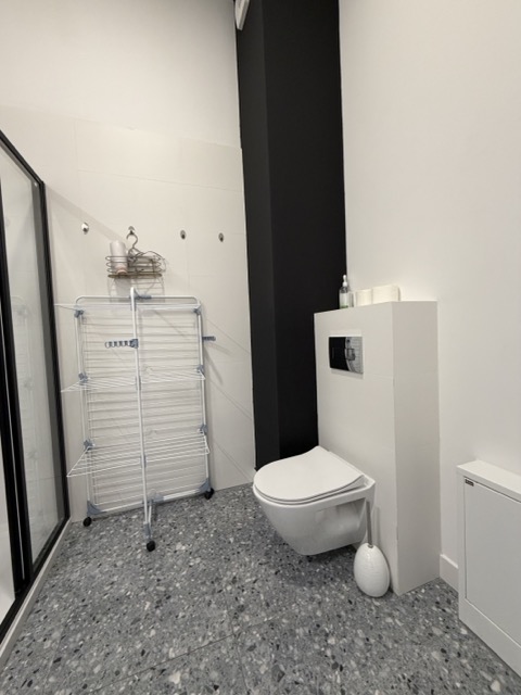 Pokój z aneksem kuchennym, łazienka z prysznicem oraz toaletą, taras