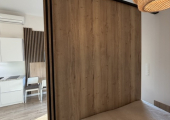 Apartament składa się z jednego pokoju z wydzieloną częścią sypialnianą oraz aneksu kuchennego. Z pokoju jest wyjście na przestronny balkon o powierzchni 15 m².